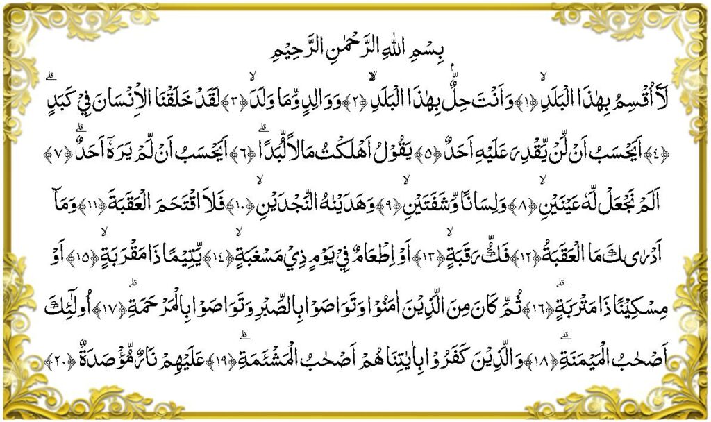 Bacaan teks lafadz surah al balad tulisan arab saja. Surah Al Balad merupakan urutan surat yang ke 90 dalam kitab Al Quran. Surah Al Balad terdiri dari 20 ayat dan termasuk Juz 30 atau Juz Amma (Surat Pendek) serta tergolongan dalam Surah Makkiyah yang diturunkan di Kota Makkah.