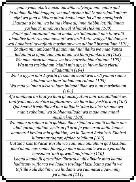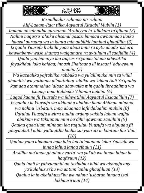 Bacaan teks Surat Yusuf tulisan latin saja dan arab. Surah Yusuf merupakan urutan surat ke 12 dalam kitab suci Al Qur’an. Yusuf artinya adalah “Nabi Yusuf” yaitu dalam surah meriwayatkan kisah tentang kehidupan Nabi Yusuf. Surat Yusuf ini termasuk dalam golongan surah Makkiyah yang diturunkan di Kota Mekkah dan terdiri dari 111 ayat serta merupakan Juz yang ke 12 dan 13.
